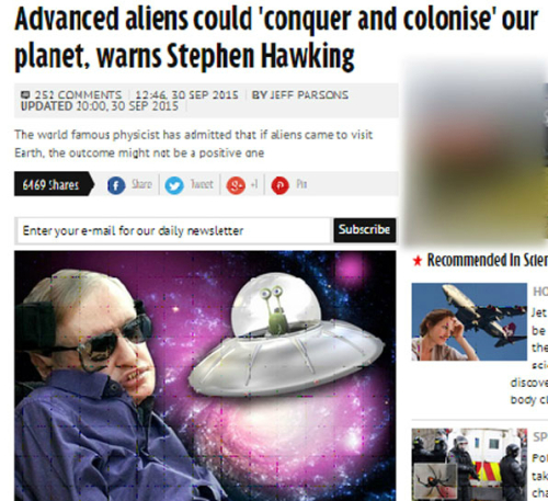 세계적으로 저명한 영국의 천체물리학자 스티븐 호킹 박사가 지적 외계 생명체의 침입 가능성에 대해 경고했다.