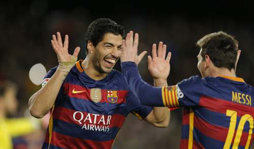 | 15일 스페인 바르셀로나 캄프 누에서 열린 프리메라리가 FC바로셀로나와 셀타 비고전에서 FC바로셀로나의 루이스 수아레스(왼쪽)가 페널티킥 상황에서 리오넬 메시의 어시스트를 골로 연결한 뒤 환호하고 있다. 바르셀로나=AP연합뉴스 |