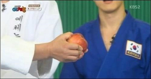 당시 강호동은 사과를 가져 온 뒤 "나는 사과를 그냥 쪼개는 것이 아니라, 가로로 절단한다”면서 사과에 양손을 얹고 가벼운 힘만으로 사과를 절단해 놀라움을 자아냈다.