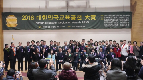 | 지난 21일 국회의원회관 대회의실에서 열린 '2016 대한민국교육공헌대상' 시상식에서 수상자들이 화이팅을 외치고 있다. |