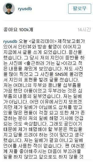 | 일베 논란에 휩싸인 배우 류준열 해명글. 사진=류준열 인스타그램 |