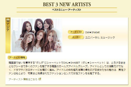 달샤벳은 이번 수상에 대해 “첫 일본 데뷔앨범으로 이렇게 뜻 깊은 상을 받게 돼 팬분들에게 진심으로 감사 드린다. 더 좋은 음악으로 보답 드릴 수 있도록 노력하겠다”라는 소감을 전했다.
