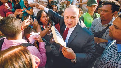 | 베네수엘라 국민들 “야당 태업으로 고통” 23일(현지시간) 베네수엘라 집권여당인 통합사회주의당(PSUV) 디오스다도 카베요 의원이 카라카스 의회 밖에서 시민들의 항의를 받고 있다. 이날 아리스토불로 이스투리스 부통령은 2015년 보고서를 의회에 제출하면서 “현재의 생필품 부족 사태는 야당의 태업 때문”이라고 주장했다. 카라카스=EPA연합뉴스 |