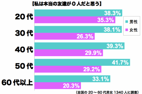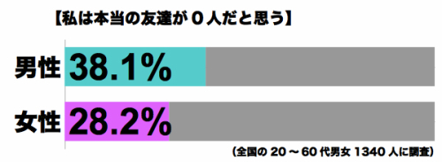 지난 1일 일본 리서치 포털 시라베에서 성인남녀 1340명을 대상으로 진정한 친구가 있는지 물은 결과 남녀 전체 30%가 '친구가 없거나 있어도 서로 신뢰할 관계는 아니다'라고 응답했다. 성별로 보면 남성은 38.1%가 여성은 28.2%가 위와 같이 답했다.