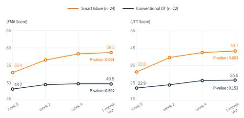 | 전통적인 재활을 진행한 그룹(파란색)보다 스마트 글러브를 병행한 그룹(주황색)이 푸글 마이어와 잽슨 테일러 평가에서 통계적으로 유의미한 결과를 보여 회복속도가 더 빠른 것으로 나타났다. |