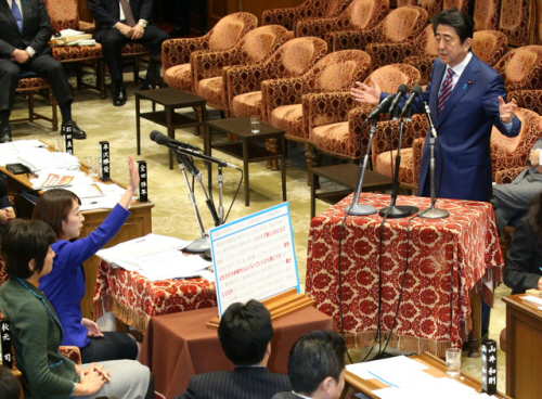 | 아배 총리에게 질문을 던지는 민주당 야마오 시오리 의원. 야마오의원의 발언이 시작되자 동료 의원들은 야유를 보냈다. |