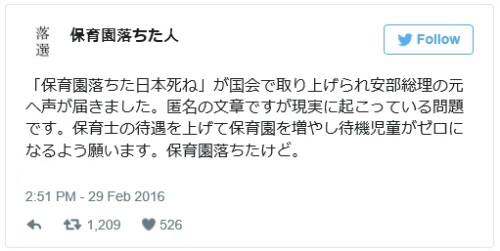 여성은 지난 15일 아이를 공립 보육원에 맡기려 했다가 선발에서 떨어지자 분노와 함께 아베 총리가 내세우는 '1억 총 활약 사회' 구상이 실현되지 못하고 있다는 지적과 "아이를 낳아 기르며 사회생활을 하고 세금을 내는데 일본(정부)은 뭐가 불만인가"라는 글을 남겼다.