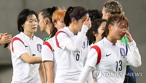 | 7일 오후 일본 오사카 얀마 스타디움에서 열린 2016 리우올림픽 여자축구 아시아지역 최종예선 대한민국과 중국의 경기. 1-0으로 패한 대한민국 선수들이 아쉬워하고 있다. |