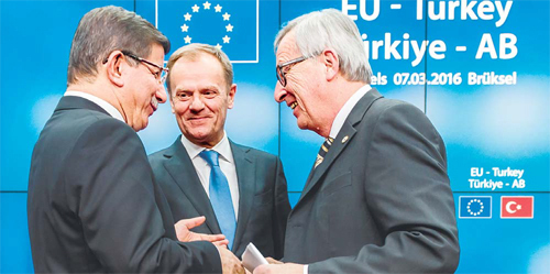 8일(현지시간) AFP통신 등에 따르면 도널드 투스크 EU 정상회의 상임의장은 벨기에 브뤼셀에서 열린 EU와 터키 간의 12시간에 걸친 정상회의 직후 “터키가 국제법상 보호받을 필요가 없는 (비정상적) 이주민들을 대거 받아들이기로 약속했다”며 “비정상적 이주민들이 유럽으로 올 수 있는 시대는 끝났다”고 밝혔다. 아흐메트 다부토울루 터키 총리 역시 “출신지에 상관없이 현재 터키를 거쳐 그리스로 간 비정상적 이주민들을 모두 수용하겠다”고 말했다.