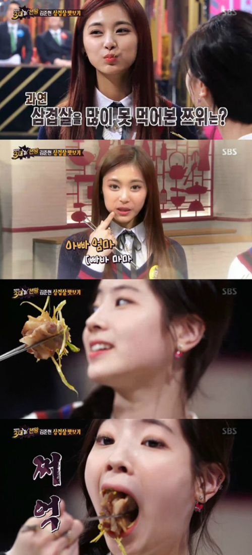 쯔위, 다현은 지난 5일 방송된 SBS '토요일이 좋다-백종원의 3대천왕'에서 개그맨 김준현과 함께 스테이지를 누비며 삼겹살을 먹는 모습을 보여줬다.