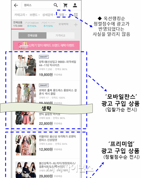 공정위에 따르면 오픈마켓 3사는 화면 상단에 광고 구입 상품을 우선 전시하거나, 상품정렬점수를 산정할 때 광고 구입 여부와 금액에 따른 가점을 부여했다. 일례로 옥션의 경우 '옥션랭킹순'의 '급상승' 광고 구입 시, 입점 사업자가 원하는 순위와 현재 순위와의 차이만큼 가점을 부여해 원하는 순위로 상품을 전시했다.