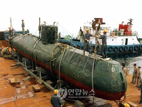 | 1998년 6월 속초 앞바다로 침투 중 어망에 걸려 표류하다 우리 해군에 예인된 북한 유고급 잠수정 |