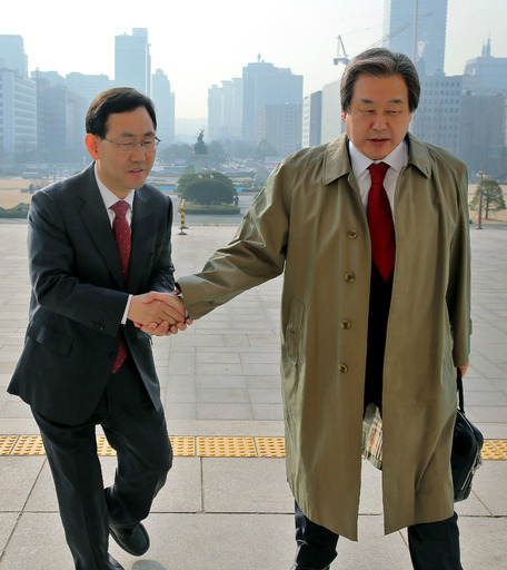| 새누리당 4·13 총선 공천에서 배제된 주호영 의원(왼쪽)이 16일 오전 최고위원회의에 참석하기 위해 국회로 들어오는 김무성 대표(오른쪽)의 손을 잡으며 억울함을 호소하고 있다. 연합뉴스 |