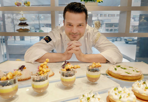 | 미국의 10대 페이스트리 셰프로 선정된 밥 트루잇이 15일 오후 웨스틴조선 호텔 내 디저트 매장에서 본인이 개발한 메뉴를 앞에 두고 사진촬영을 위해 포즈를 취하고 있다.하상윤 기자 |