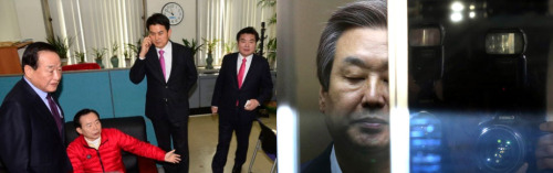 | 새누리당 김무성 대표가 비박(비박근혜)계 의원 공천배제에 대한 추인을 거부하며 17일 오전으로 예정된 최고위원회의를 취소하자 친박(친박근혜)계 지도부가 원내대표 부속실에 모여 대책을 논의하고 있다. 왼쪽 사진 왼쪽부터 서청원, 이인제, 김태호 최고위원과 원유철 원내대표. |