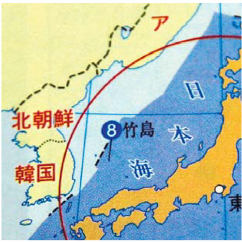 | 18일 일본 문부과학성의 검정을 통과한 일본 고교 사회 교과서 지도에 독도가 파란색으로 구분된 일본 영해 안에 포함돼 있다. 도쿄=연합뉴스 |