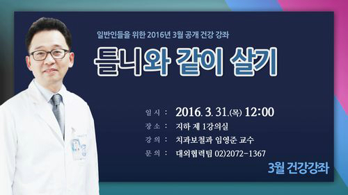 서울대학교치과병원(원장 류인철)이 3월 31일(목) 낮 12시 치과병원 지하 1강의실에서“틀니와 같이 살기”를 주제로 무료공개강좌를 개최한다고 22일 밝혔다.