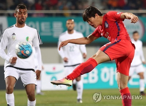 | 25일 오후 경기도 이천종합운동장에서 열린 KEB 하나은행 초청 올림픽대표팀 대한민국 대 알제리 친선경기. 한국 권창훈이 슛을 하고 있다. |
