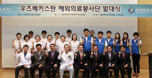 서울대학교치과병원(병원장 류인철)은 지난 3월 28일(목) 지하 제1강의실에서 신한은행과 함께 ‘2016 우즈베키스탄 해외의료봉사단 발대식’을 가졌다고 29일 밝혔다.