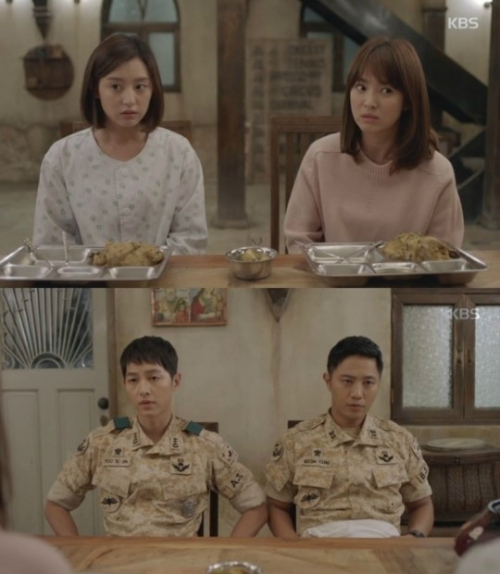 이날 강모연과 윤명주는 유시진(송중기 분)과 서대영(진구 분)이 정성껏 마련한 삼계탕을 먹던 중 과거 추억에 젖었다. 먼저 윤명주가 자주 가던 학교 앞 삼계탕 가게를 언급하자 강모연은 “민윤기랑 둘이 같이 삼계탕 먹는 거 봤다”고 말했다.