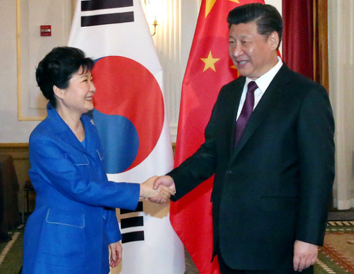 한·중 정상은 또 미국의 사드(THAAD·고고도미사일방어체계) 한반도 배치 문제에 대해 정상 차원에서 처음으로 의견을 교환했다. 김규현 수석은 “(한·중) 양측의 기존 입장에 관한 의견 표명이 있었고, 앞으로 그 문제에 관해 소통을 계속하기로 했다”고 말했다. 박 대통령은 사드 논의는 국익·안보 관점에서 북한 위협에 대응하기 위한 것이라는 원칙적 입장을 재강조한 반면, 시 주석은 반대 입장을 표명한 것으로 알려졌다. 시 주석은 앞서 버락 오바마 미국 대통령과의 미·중 정상회담에서도 “미국이 한국에 미사일 방어시스템을 배치하는 데 단호히 반대한다”고 밝혔다.