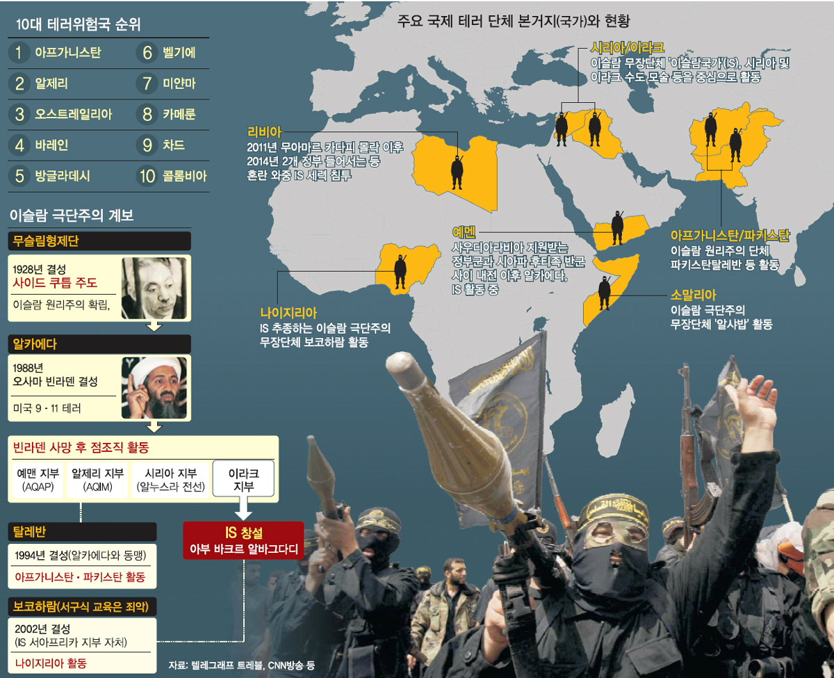 중동에서 세를 불려가던 알카에다를 전 세계에 알린 사건이 2001년 미국 맨해튼 쌍둥이빌딩 등을 타깃으로 했던 9·11테러다. 알카에다는 덩치가 커지면서 아프간을 넘어 예맨, 시리아, 이라크에 지부가 생겼다. 알카에다 이라크 지부는 현재 무차별 테러로 악명을 떨치고 있는 IS의 전신으로 알려져 있다.