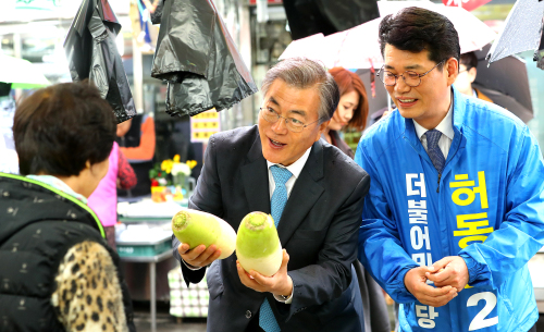 | 더불어민주당 문재인 전 대표(가운데)가 3일 오후 서울 동작을에 출마한 허동준 후보와 함께 남성시장을 방문해 한 야채 상인에게 무를 구입하며 지지를 호소하고 있다. 연합뉴스 |