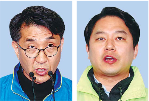 서울 중구성동을 더불어민주당 이지수 후보(왼쪽)와 국민의당 정호준 후보가 3일 국회에서 각각 기자회견을 열어 단일화 원칙 합의 사실을 밝히고 있 다.