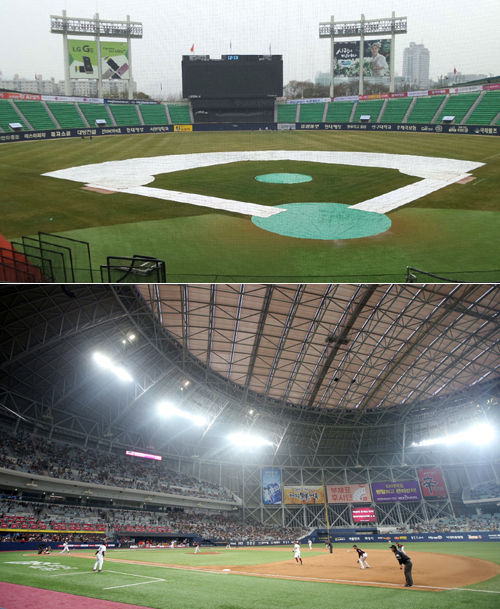 | 경기 시작 시간엔 거의 그쳤음에도 3일 잠실구장(위) LG-한화 경기는 취소된 반면 고척 스카이돔에서는 비와 상관없이 경기가 열려 개막 3경기 만에 ‘돔구장 효과’를 체감하게 했다. |
