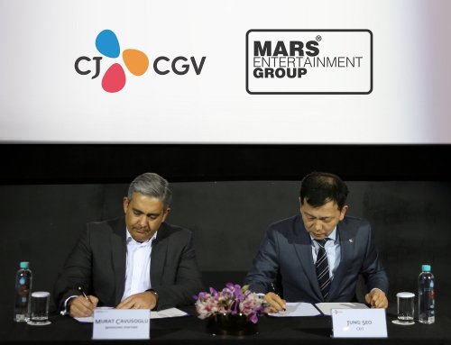 악트라그룹 무랏 차부쇼울루 대표와 CJ CGV 서정 대표(오른쪽)가 마르스 엔터테인먼트 그룹 인수 계약서에 서명하고 있다. CGV 제공 |