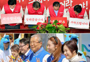 | 춤추고 더불어민주당 허영 후보(강원도 춘천) 지원유세에 나선 김종인 비상대책위 대표(가운데)가 7일 오전 강원도 춘천시 춘천풍물시장 앞에서 로고송에 맞춰 춤을 추고 있다. 춘천=연합뉴스 |