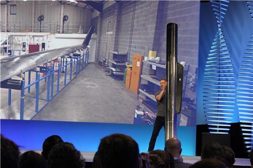 | 12일(현지시간) F8 개발자 회의에서 페이스북의 향후 10년간 비전을 설명하면서 오지에 인터넷 신호를 무선으로 쏘아 주는 무인기 `아퀼라`의 부품을 보여 주는 마크 저커버그 CEO |