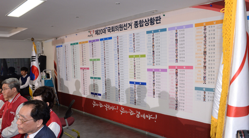 | 텅텅 빈 당선자 표시 새누리당 관계자들이 13일 서울 여의도 당사 종합상황실에서 침울한 표정으로 개표방송을 지켜보고 있다. 당선자 표시도 하지 않은 종합상황판에서 을씨년스러운 분위기가 묻어난다. 이제원 기자 |