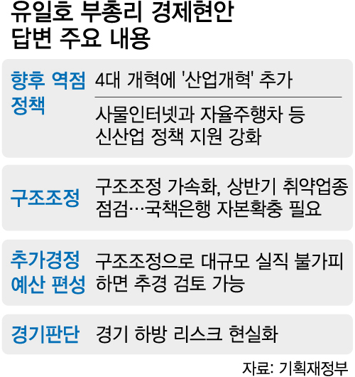 정부는 경기 우려에 대해 우선 재정보강 조치로 대응하기로 했다. 유 부총리는 “2분기 재정조기집행 목표를 상향 조정할 필요가 있다. 하반기에는 공기업을 활용한 재정보강도 검토하고 있다”고 말했다. 그는 앞서 여러 차례 밝혔듯 “추경은 현재로서는 고려하지 않는다”고 선을 그었다. 그럼에도 “우리 경제에 심각한 하방 위험이 있다면 추경뿐 아니라 다른 수단도 동원해야 한다”며 여지를 뒀다. 이어 “구조조정으로 대규모 실직 사태가 불가피하다면, 그것이 추경 요인이 된다면 생각해보겠다”고 덧붙였다.