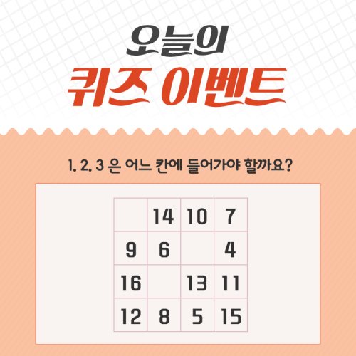 칸 안에는 다는 아니지만 4에서 16까지의 숫자가 무작위로 들어가 있습니다. 아주 간단한 규칙 두 가지에 의거해 숫자를 칸에 넣는다고 했을 때 1,2,3은 어느 칸에 들어가야 할까요?