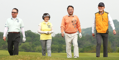 내수 살리기 골프회동 유일호 부총리 겸 기획재정부 장관(왼쪽 세 번째)과 경제단체장들이 지난달 30일 경기 여주시 남여주 골프클럽에서 티샷을 한 뒤 함께 걸으며 얘기를 나누고 있다. 이번 골프 회동은 박근혜 대통령이 지난달 26일 청와대에서 공직자 골프 문제와 관련해 “좀 자유롭게 했으면 좋겠다고 생각한다”고 밝힌 이후 이뤄졌다. 박근혜정부 출범 이후 고위 공직자와 경제인들이 공개적으로 골프를 친 것은 이번이 처음이다. 왼쪽부터 박용만 대한상공회의소 회장, 한무경 한국여성경제인협회 회장, 유 부총리, 허창수 전국경제인연합회 회장.