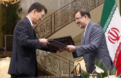 | 강호인 국토교통부 장관(왼쪽)이 2일 오후(현지시간) 테헤란 사드아바드 좀후리궁에서 압바스 아훈디 이란 도로도시개발 장관과 인프라협력 양해각서(MOU)를 교환하고 있다. 한국과 이란은 이날 철도, 도로, 공항, 항만, 수자원 등 19개 분야에서 양해각서를 체결했다. 테헤란=서상배 선임기자 |