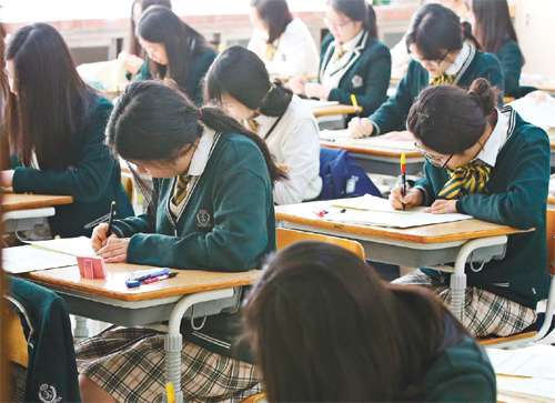 | 개정 교육과정에 따라 올해 대학수학능력시험에서 수학 과목은 가/나형 모두 출제범위가 바뀌고 학습 양도 많은 만큼 남은 기간 성적대별로 가장 중요한 목표를 잡고 이에 맞춰 학습전략을 짜는 것이 중요하다. 사진은 지난 3월 서울의 한 고등학교 3학년 학생들이 전국연합학력평가에 임하고 있는 모습. 세계일보 자료사진 |