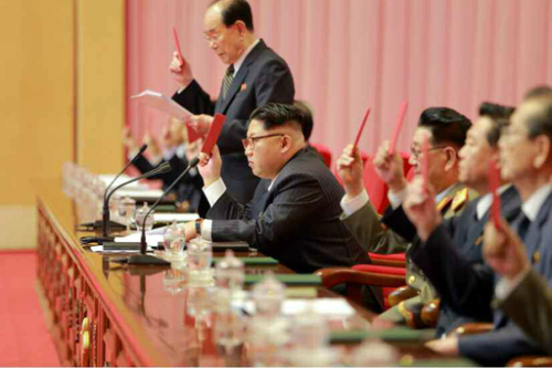 | 6일 평양 4·25문화회관에서 제7차 노동당 대회가 시작됐다고 북한 노동신문이 7일 보도했다. 사진은 이날자 노동신문에 실린 김정은 국방위원회 제1위원장(가운데) 등 주석단 인물들 모습. 연합뉴스 |