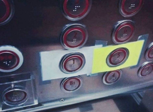 한 아파트에 있는 것으로 추정되는 사진 속 엘리베이터의 층수 버튼에는 1층과 5층, 두 개 버튼에만 색종이가 붙어있다. 색종이는 버튼을 누를 수 있도록 가운데가 둥글게 뚫려있는 모양이며 1은 흰색, 5는 노란색 종이다. '아이가 장난이라도 쳤나' 하는 생각이 들 법하다.