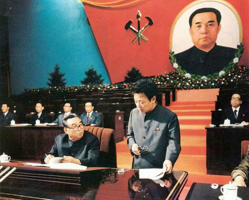 | 1980년 10월 개최된 제6차 노동당대회 모습. 김일성 주석(앞줄 왼쪽)과 김정일 국방위원장(당시 정치국 상무위원이자 노동당 비서)이 이야기를 나누고 있다. 세계일보 자료사진 |