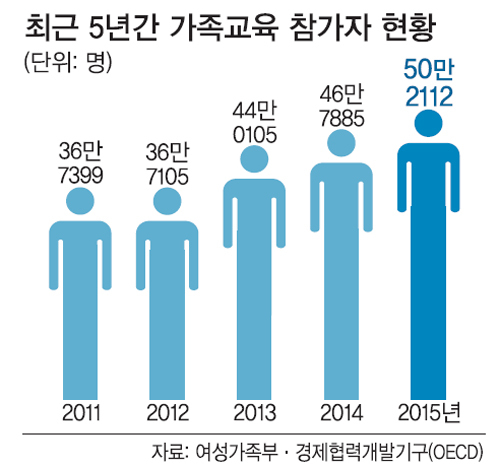 강주현 서대문구 건강가정·다문화가족지원센터장은 “요즘에는 어머니뿐 아니라 아버지의 가족교육 참여도 점차 늘고 있다”며 “자녀 교육 문제로 처음 온 부모들도 교육 막바지에는 본인의 문제점을 발견한 뒤 자신이 먼저 변하겠다는 이야기를 많이 한다”고 말했다. 건강가정지원센터(www.familynet.or.kr)의 가족교육은 2004년 시범사업을 시작으로 매년 참가자가 늘어 지난해 50만2112명이 교육을 받았다.