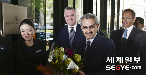 포시즌스 호텔 앤 리조트의 빌 게이츠와 함께 최대 주주인 사우디아라비아의 알 왈리드 빈 탈랄(Al Waleed Bin Talal) 왕자가 16일 오후 서울 광화문 포시즌스 호텔을 방문해 서울 총지배인 루보쉬 바타(Lubosh Barta)와 함께 호텔에 들어서고 있다. 사우디아라비아의 국왕인 살만 빈 압둘아지즈 알사우드 (Salman bin Abdulaziz AlSaud)의 사촌동생인 알 왈리드 빈 탈랄 왕자는 투자 회사인 킹덤홀딩의 최고 경영자(CEO)로, 킹덤홀딩은 디즈니와 21세기폭스, 뉴스코프, 애플, 제너럴모터스 등의 지분을 대거 보유하고 있다.