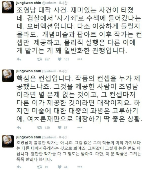진중권은 지난 16일 자신의 트위터에 “조영남 대작 사건. 재밌는 사건이 터졌네. 검찰에서 ‘사기죄’로 수색에 들어갔는데, 오버액션입니다”라고 말했다.
