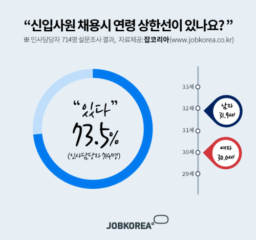 잡코리아가 설문에 참여한 인사담당자들에게 ‘신입직 사원을 뽑을 때 적정한 연령에 대한 상한선이 있다고 생각하느냐’고 질문한 결과 73.5%가 ‘있다’고 답했다.