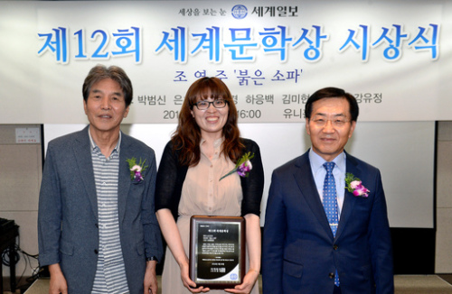 ‘붉은 소파’로 세계문학상 대상을 받은 조영주(37)씨는 “수상 소식을 듣고 처음에 깜짝 놀랐다”며 “상을 탈 거라고 상상도 못 했는데 앞으로 더 열심히 쓰겠다”고 씩씩한 소감을 밝혔다. 조씨는 “소설을 써서 두 번을 폐기한 뒤 세 번째 버전을 지난해 12월 22일에 아는 분께 보여드렸는데 혹평을 하기에 (홧김에 마감 하루 전날인) 23일에 부랴부랴 제본해서 제출했다”며 “내고 나서도 ‘내가 무슨 짓을 했나 싶었다’”고 당시 상황을 전했다. 조씨는 시상식에서 상패와 5000만원의 고료를 받았다.