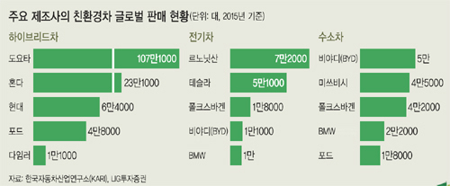 이에 자동차업계는 경쟁하듯 친환경차를 내놓고 있다. 지난 4월 말 중국 베이징모터쇼에서는 147개의 전기차 신모델이 전시됐고, 지난 3일 시작된 2016부산국제모터쇼에서도 국내외 업체들이 친환경차를 대거 선보였다. 글로벌 친환경차 시장은 일본 도요타와 닛산, 혼다, 중국 비야디(BYD), 미국 테슬라 등이 주도하고 있다. 하지만 현대차가 지난해 전 세계 하이브리드차 판매 3위에 오르며 점차 점유율을 높이고 있다.