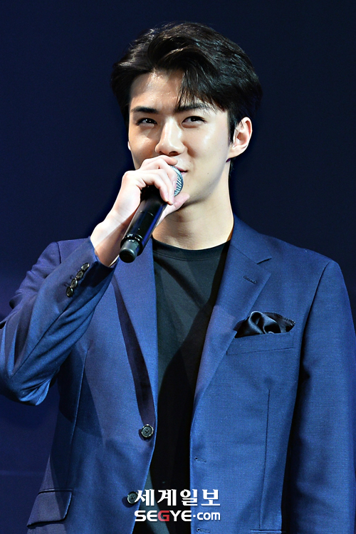 그룹 엑소 세훈이 8일 오전 서울 강남구 삼성동 SMTOWN 코엑스아티움에서 열린 정규 3집 'EX'ACT(이그잭트)' 발매 기념 기자간담회에 참석해 인사말을 하고 있다.