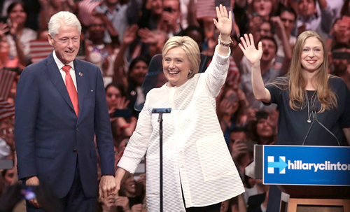 힐러리 클린턴 전 미국 국무장관이 7일(현지시간) 뉴욕주 브루클린 유세장에서 민주당 대선후보 확정을 공식 선언한 뒤 지지자에게 손을 흔들고 있다. 왼쪽부터 남편 빌 클린턴, 클린턴 후보, 딸 첼시 클린턴.