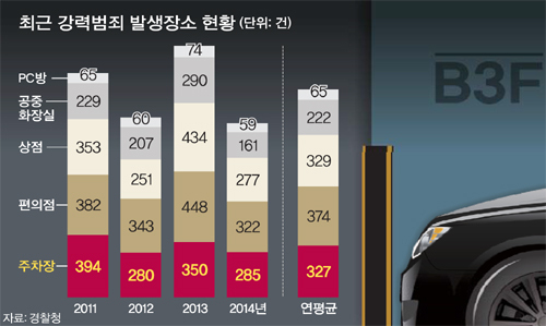 15일 경찰청에 따르면 2011~2014년 사이 연평균 327건의 강력범죄가 주차장에서 발생했다. 거의 하루 한 건꼴이다. 통상 강력범죄가 어둡고 인적이 드문 야간에 발생하는 것과 달리 주차장 범죄는 주로 여성을 노려 대낮에 일어난다.